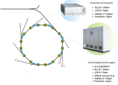 如上圖,帶電粒子束在直線和彎道的環形磁場跑道被循環加速,加速器電源作為加速器磁鐵的激勵源,與加速器磁鐵共生,電源根據給定改變輸出電流激勵磁場變化從而改變加速器粒子束按照預定軌道運動。磁鐵電源激勵磁鐵產生磁場達到注入、引出、以及聚焦粒子束等等的效果。