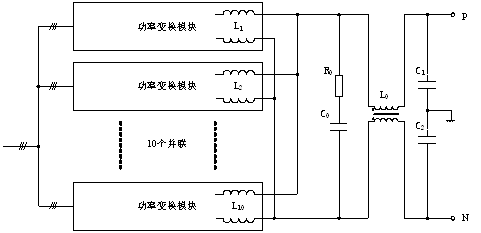 電源整機的主電路方案如下圖所示,采用功率變換模塊并聯的主電路方案。功率變換模塊內部采用多個功率組件串聯。