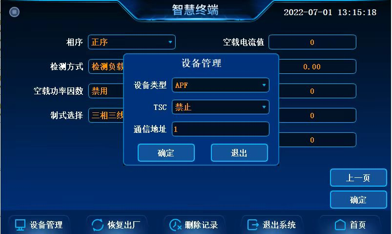 此界面的設備類型及通訊地址參數均為默認值,由顯示屏直接讀取而來,不需要手動設置。在開始對APF調試前,需要核查“設備管理”中設備情況是否符合設備使用現場的實際情況。