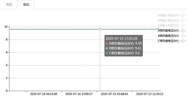 投入10kV串聯調壓裝置前,末端線路10km處電壓在9kV上下波動,考慮到裝置前后級都有負載用電的情況,補償輸出電壓設定為9.6kV;裝置投運后,電壓穩定在9.6kV左右,補償效果良好,保障了后級供電的穩定性。